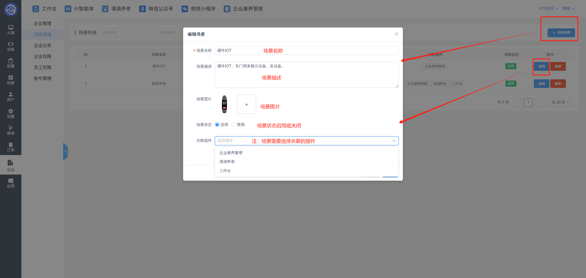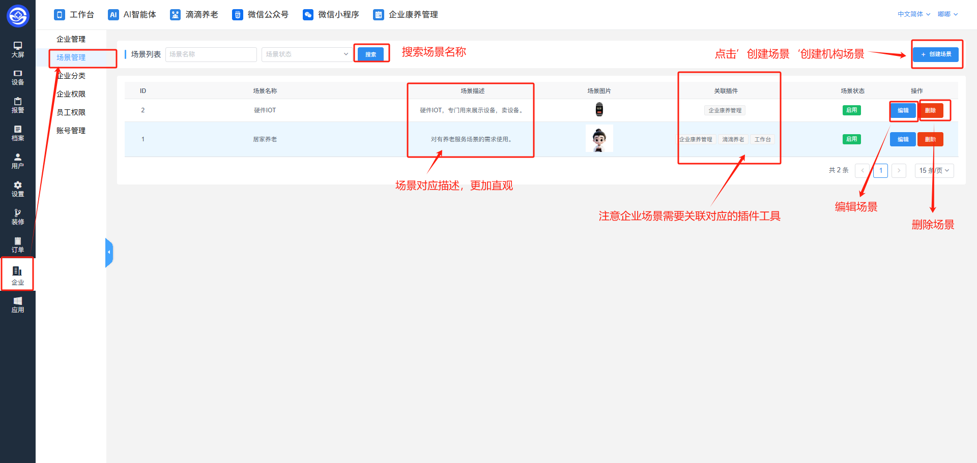 - 登录企业账号后,按需选择对应场景服务即可进入管理:硬件 IoT 场景用于设备展示、设备售卖;居家养老场景满足养老服务相关运营需求。