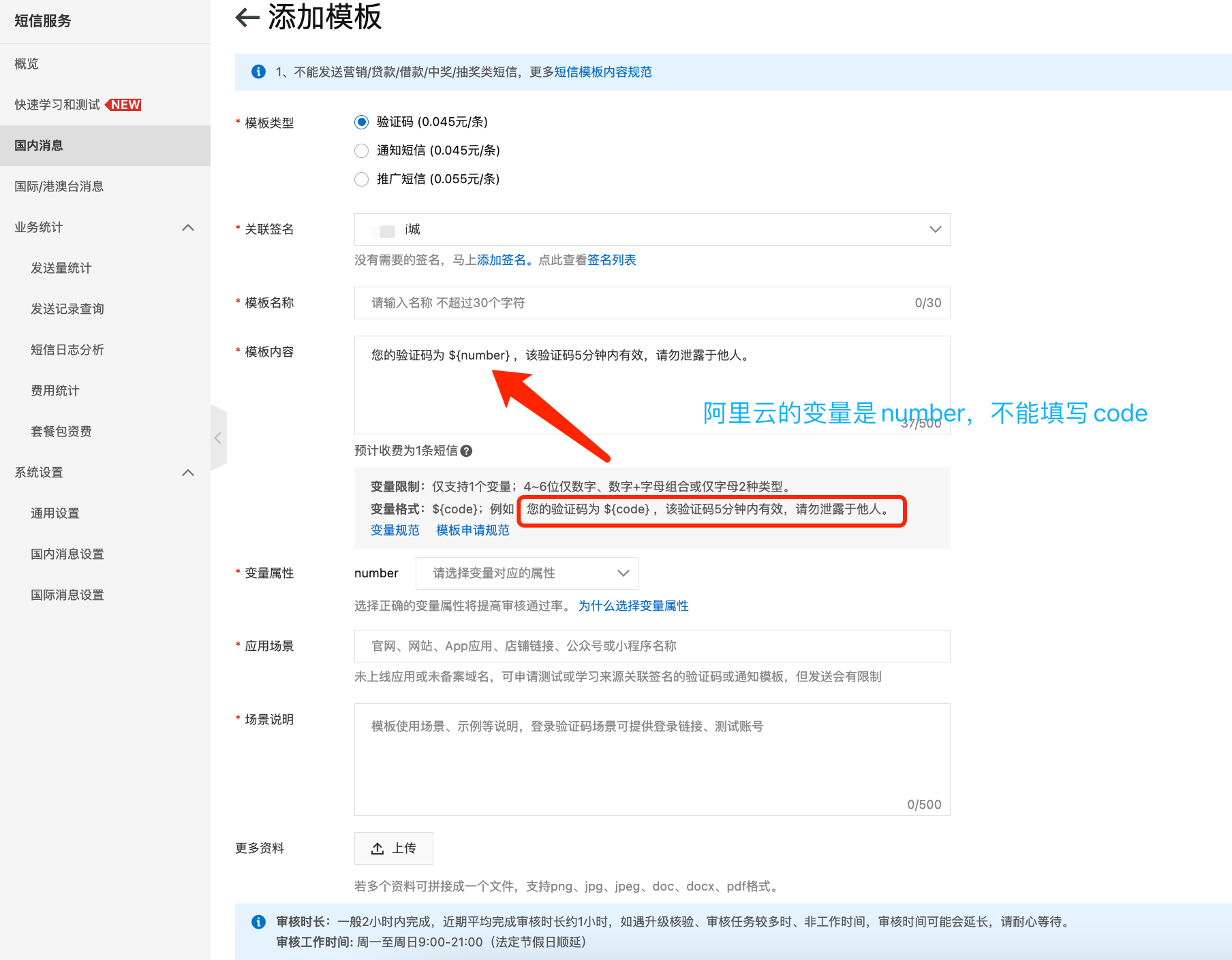 4)模版内容:您的验证码\${number},该验证码5分钟内有效,请勿泄漏于他人!【注意:阿里云的默认值是number,阿里大于的是code,两者模版默认值不一样,所以在申请阿里云短信时须注意更改为number】